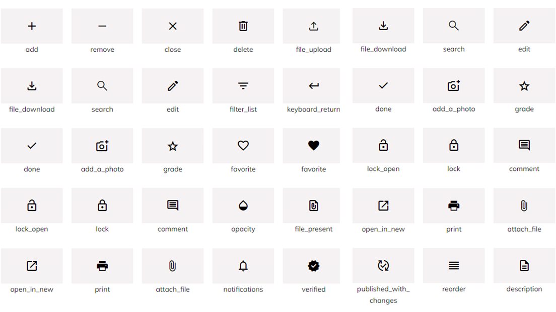 På våre nettløsninger bruker vi hovedsakelig ikoner fra Google Material Design. Vi anbefaler å bruke outlined ikoner fra google material fonten.