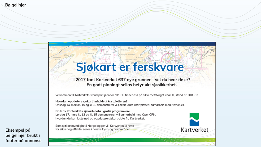 Bølgen fra Kartverkets logo finnes også i et mer fleksibelt designelement - som bølgelinjer. Elementet gir assosiasjoner til både høydekurver og sjø. Elementet kan brukes som grafisk innslag i toppen eller i bunn på annonser, flyers, organisasjonskart, og lignende.