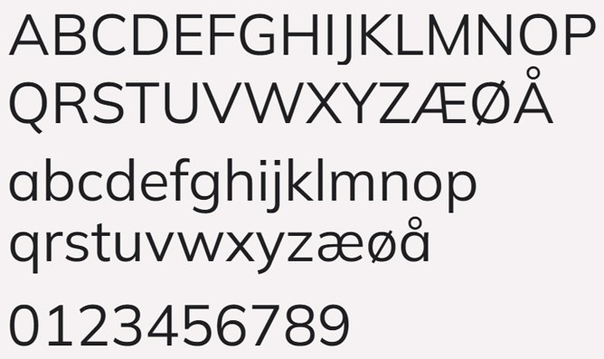 Kartverket bruker Mulish som hovedfont. Mulish er valgt fordi den er god å lese på digitale flater, blir vist likt på ulike enheter, og er praktisk å ta i bruk.
